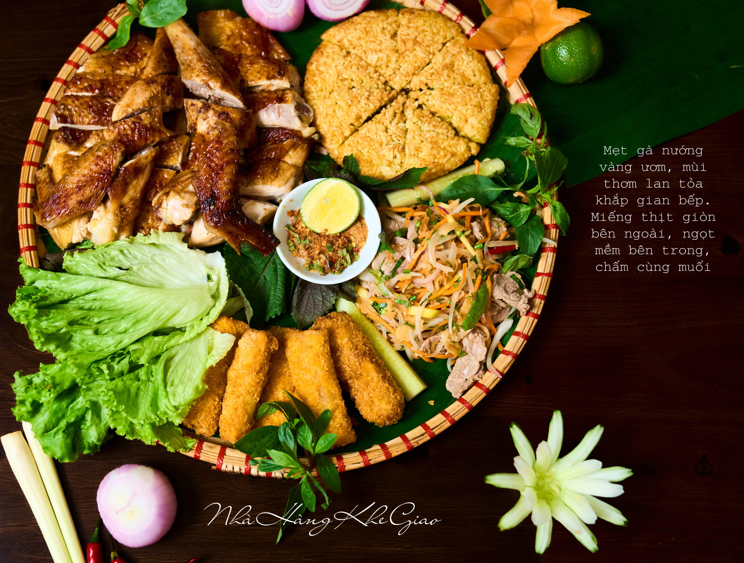 Mẹt gà nướng vàng ươm, mùi thơm lan tỏa khắp không gian bếp. Miếng thịt giòn tan bên ngoài, ngọt mềm bên trong, chấm cùng muối ớt đậm vị.